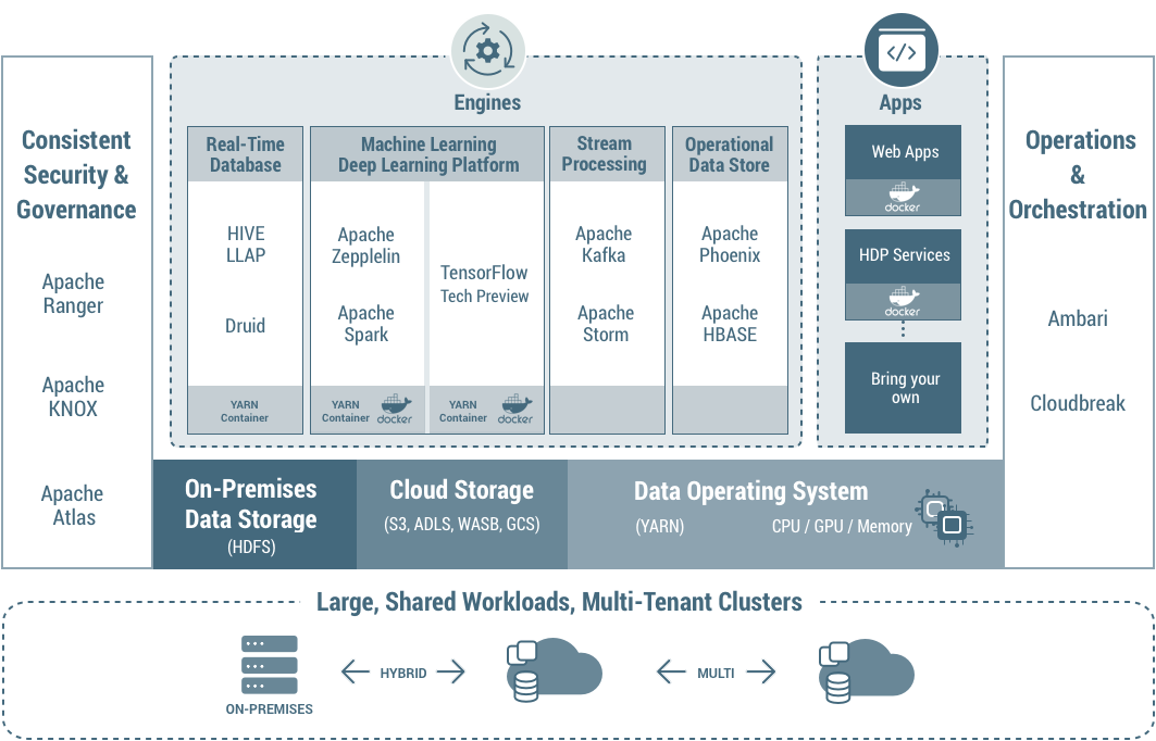 The Hortonworks Data Platform (HDP) is open source software and is the first Hadoop Distribution that supports Windows. Specifically, HDP enables the creation of a secure enterprise data lake and delivers the analytics you need to innovate faster and power real-time business insights. Here is the HDP Hybrid Architecture from its website: